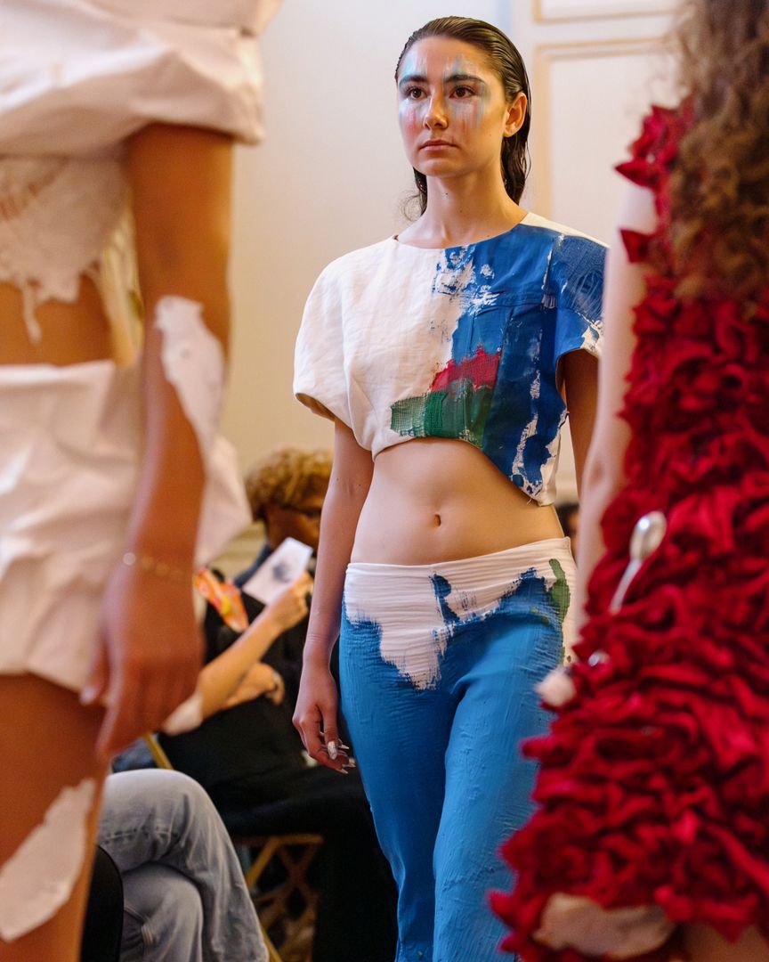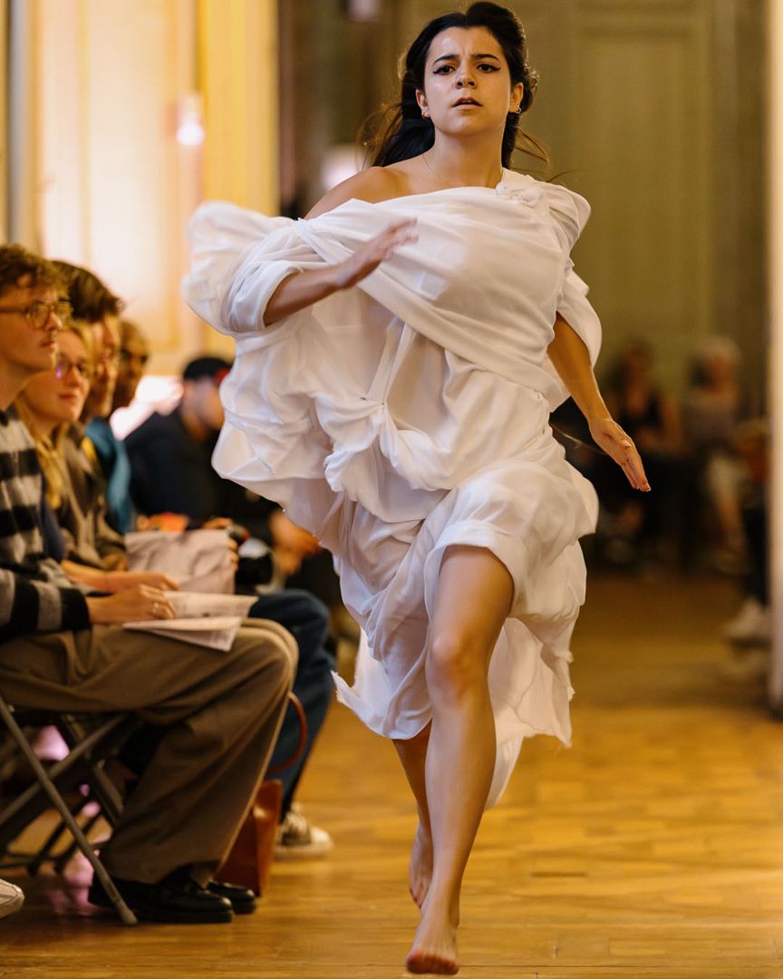Pensé comme un spectacle complet, le projet Ether s’est articulé autour d’un thème évocateur : le chaos poétique. Au-delà du catwalk traditionnel, les étudiants et équipes enseignantes ont imaginé une scénographie immersive dans laquelle les créations textiles se sont entremêlées à une composition musicale originale imaginée par les étudiants de l’école SAE Institute, graphiques et surtout, à une performance dansée, conçue comme un véritable prolongement des silhouettes et de leurs intentions esthétiques. Le vêtement ne se contente pas d’être porté il devient mouvement, émotion, langage.