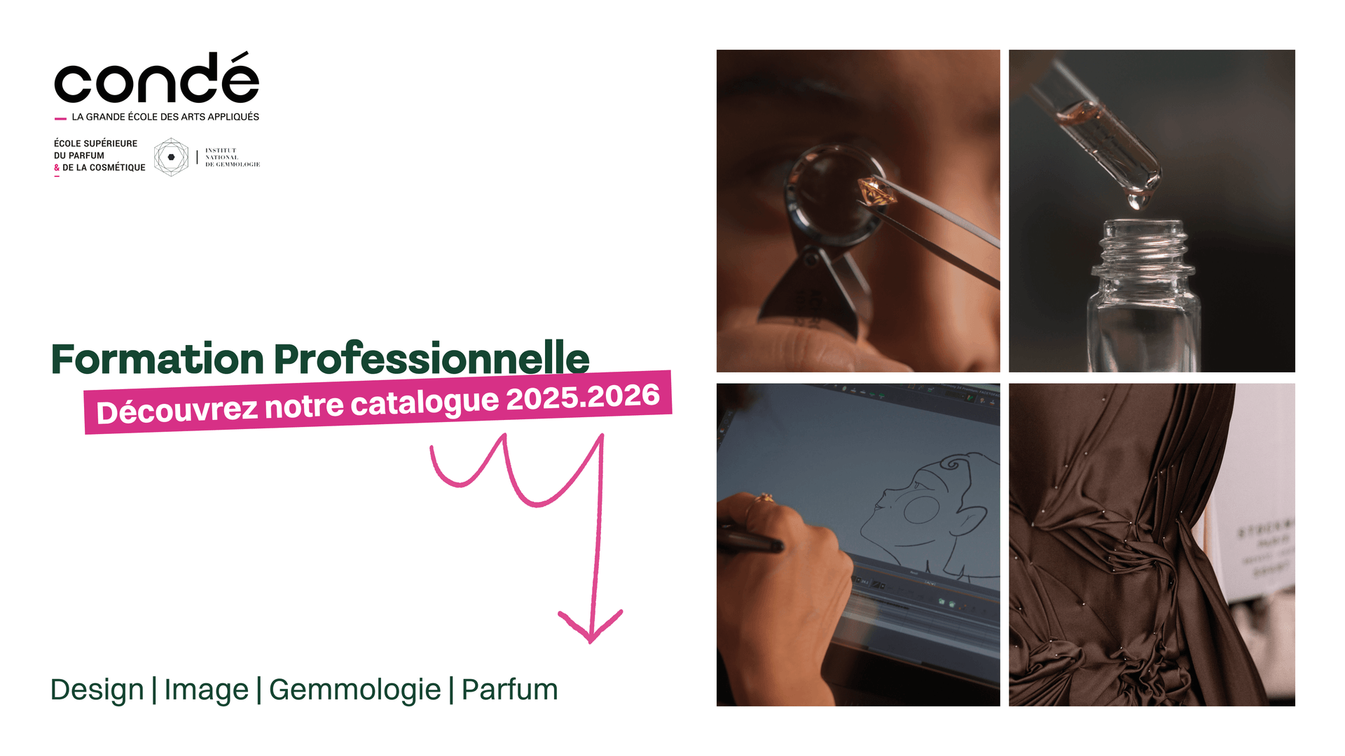En 2025, Condé, l’Institut National de Gemmologie et l’École Supérieure du Parfum et de la Cosmétique s’unissent pour former un écosystème pédagogique unique au service des métiers du design, de l’image, de la création, des sciences du sensible et de la gemmologie.