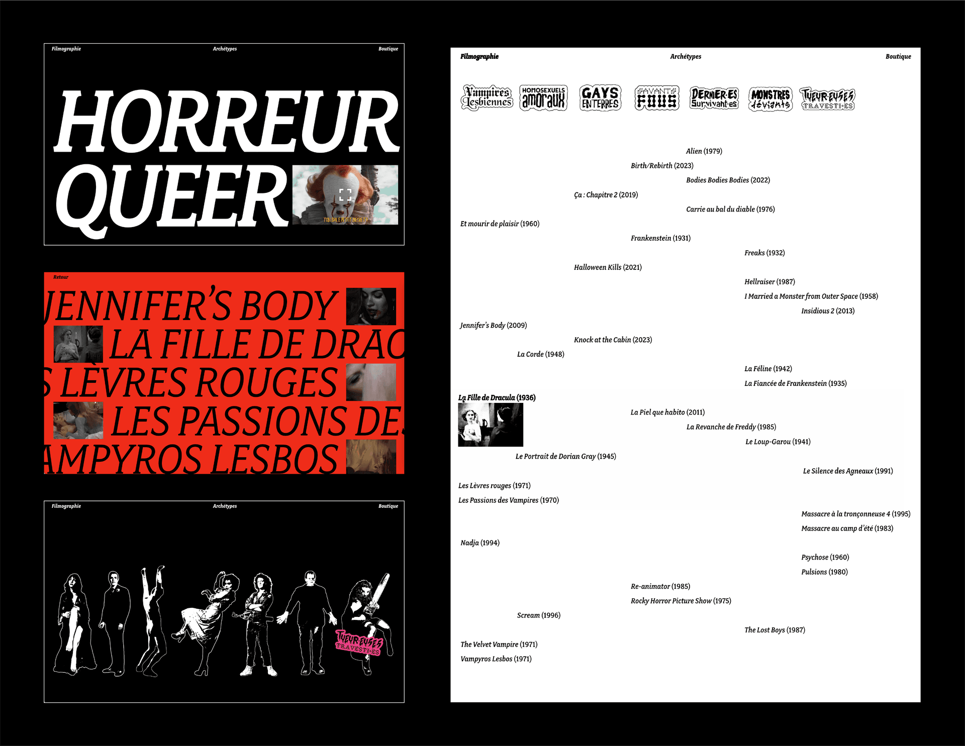 Le cinéma d’horreur a longtemps utilisé des personnages LGBTQ+ comme des archétypes de la monstruosité, incarnant ainsi la déviance des normes hétéronormatives. Pourtant, ces mêmes figures ont été réappropriées par la communauté queer, transformées en symboles de fierté et de résistance. C’est cette double facette que je souhaite mettre en lumière à travers mon projet. La collection de livres «Inverti·es : Les Personnages queer du cinéma d’horreur» explore cette dynamique. Chaque tome est consacré à un archétype de l’horreur queer. À travers une analyse nuancée, ces ouvrages cherchent à comprendre comment ces figures ont été construites, comment elles ont évolué au fil du temps et comment elles ont été réinterprétées par les cinéastes et les spectateurs queer.